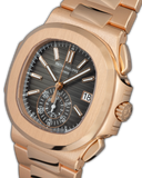 The Patek Philippe Nautilus Chronograph 5980/1R-001 represents the perfect fusion of sporty design and uncompromising luxury. Crafted entirely from 18K rose gold, the watch features a 40.5 mm case with the iconic porthole-inspired shape designed by Gérald Genta. Its surfaces alternate between satin brushing and mirror polishing, highlighting the sophisticated geometry of the Nautilus.