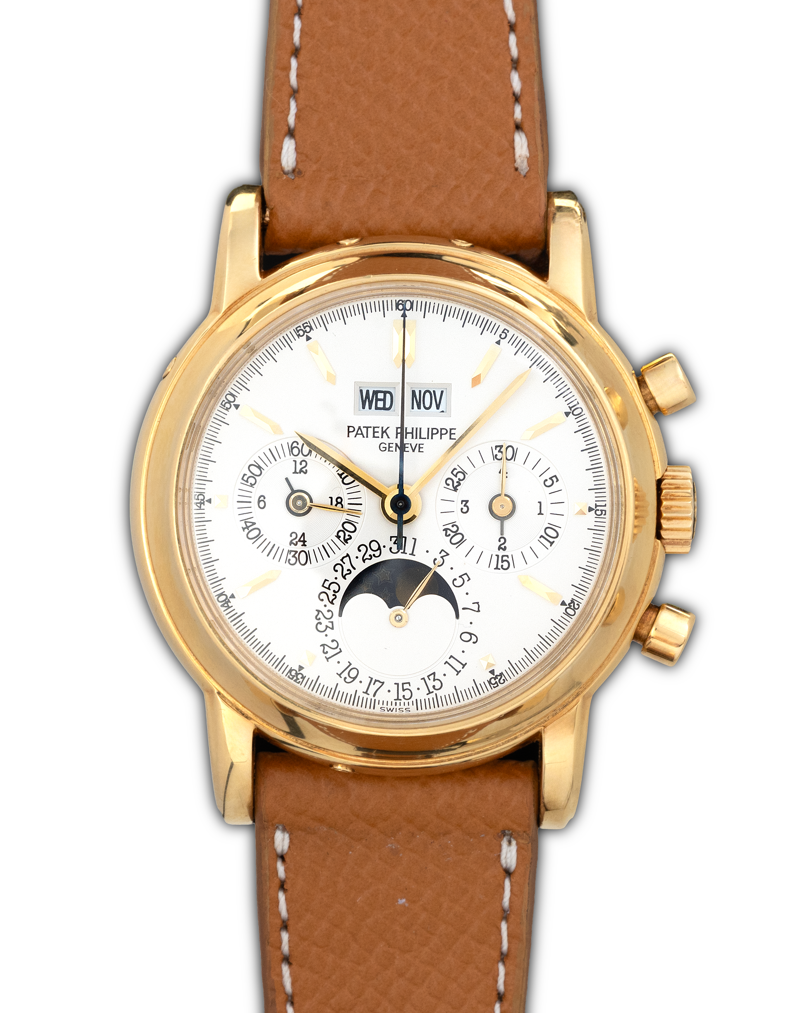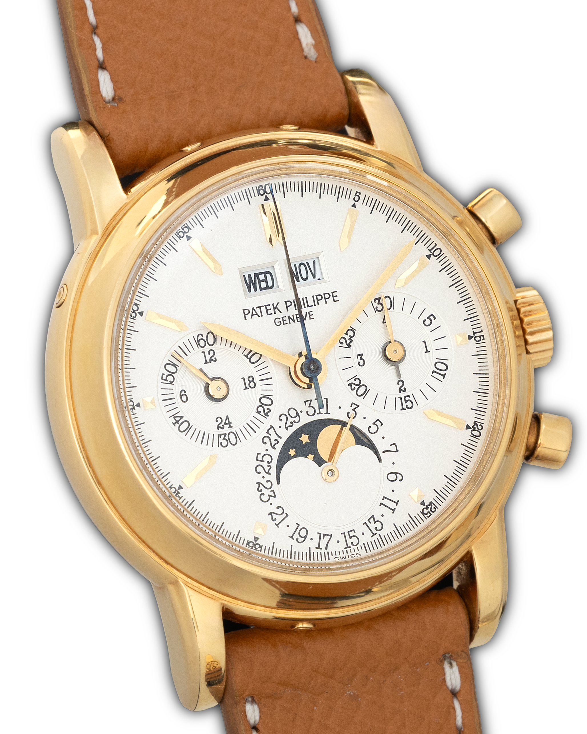 The Patek Philippe 3970E is an iconic perpetual calendar chronograph in yellow gold, representing one of the most important classical complications of modern Patek Philippe production.