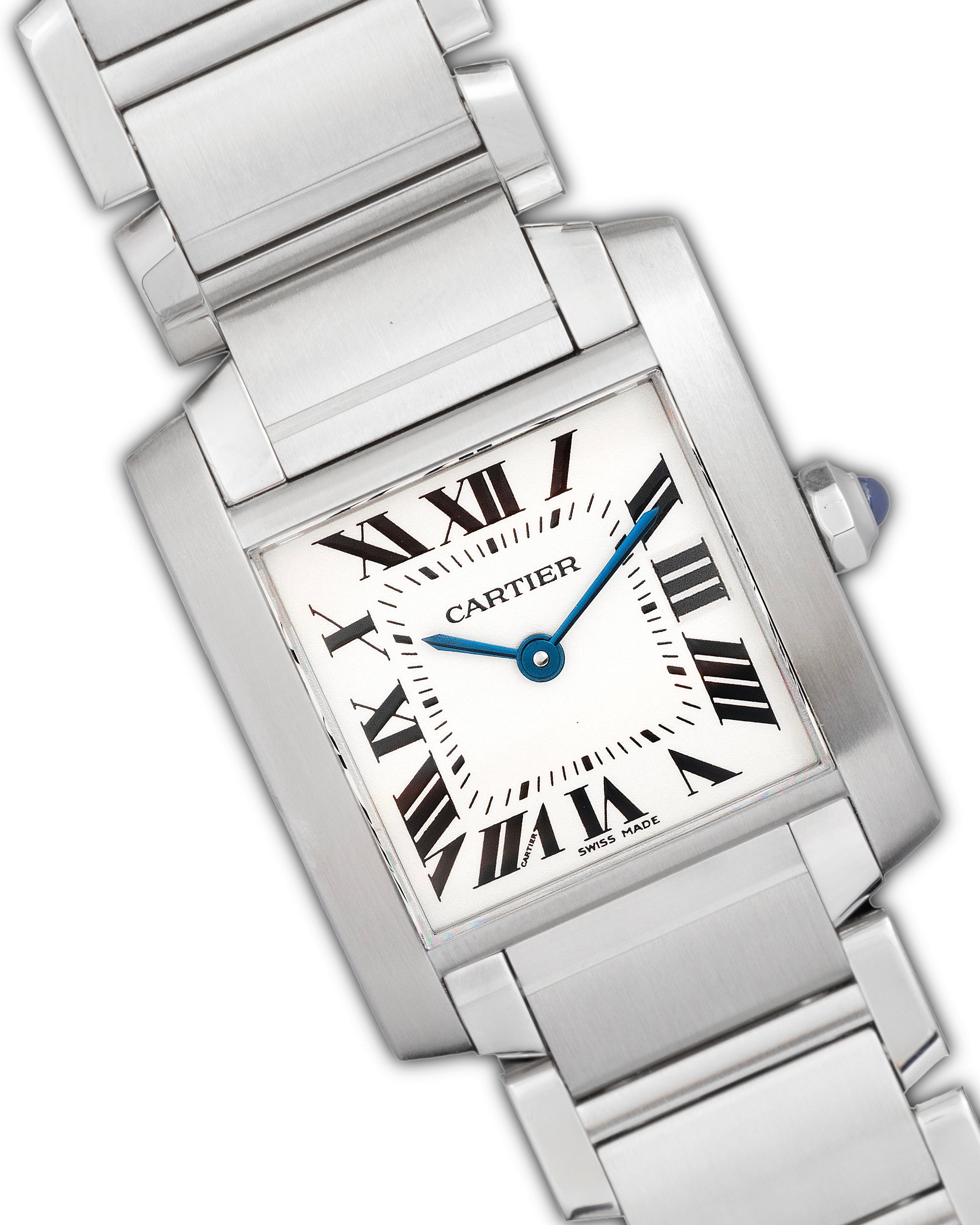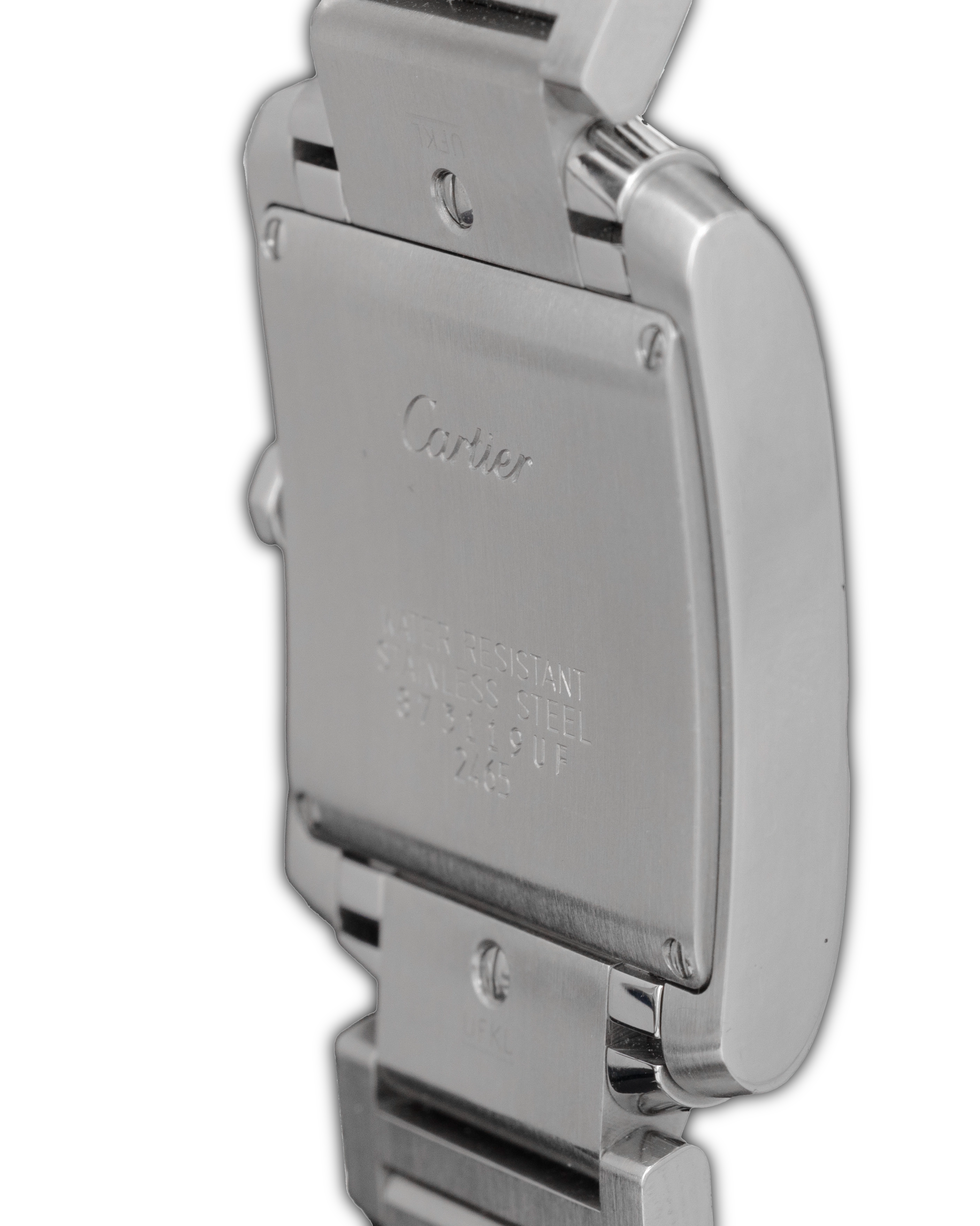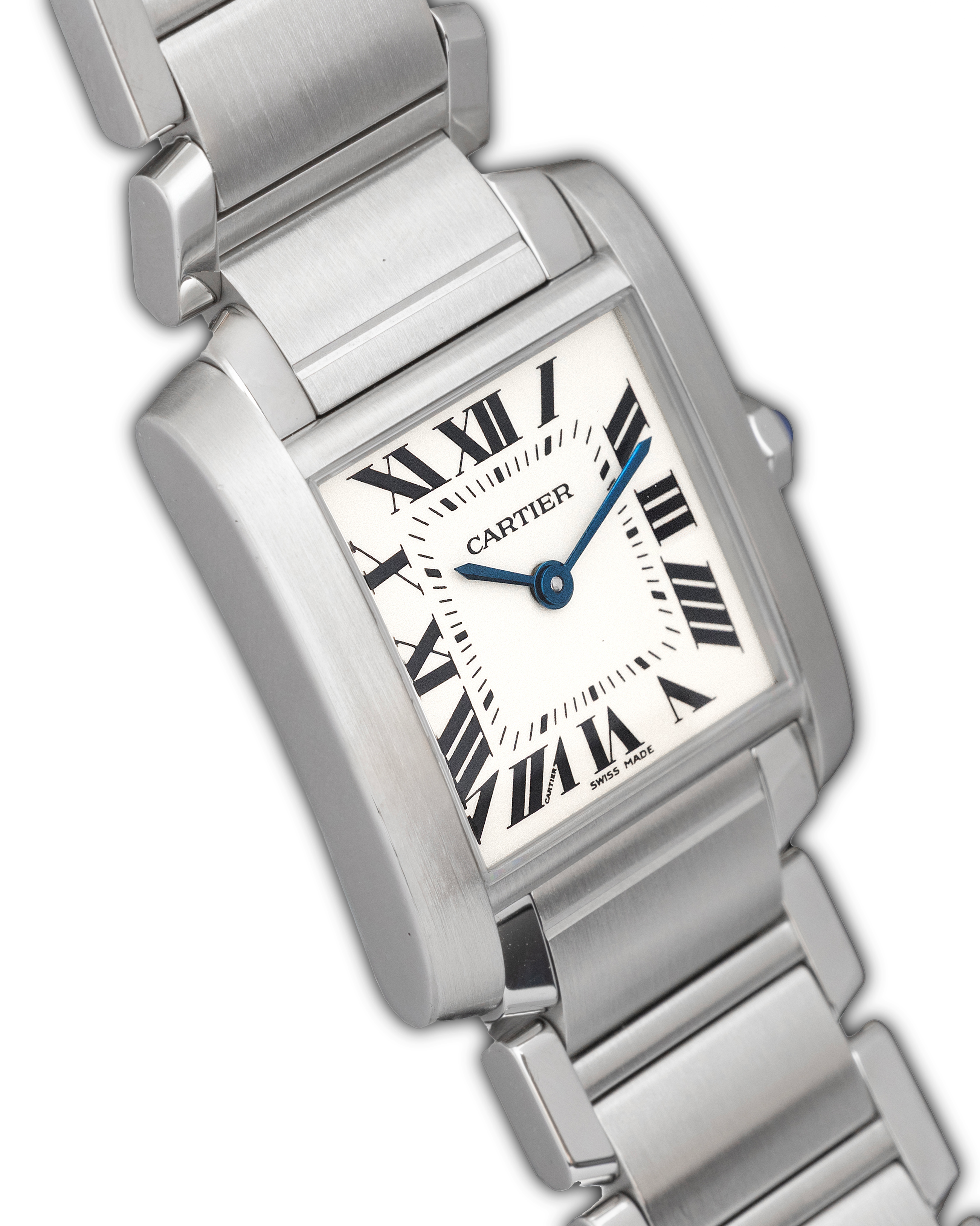 Crafted from stainless steel, the 25 mm case features Cartier’s signature polished brancards framing a silvered dial with bold black Roman numerals and a chemin-de-fer minute track. The elegant blued-steel sword-shaped hands complete the unmistakable Cartier aesthetic, while a scratch-resistant sapphire crystal protects the dial.