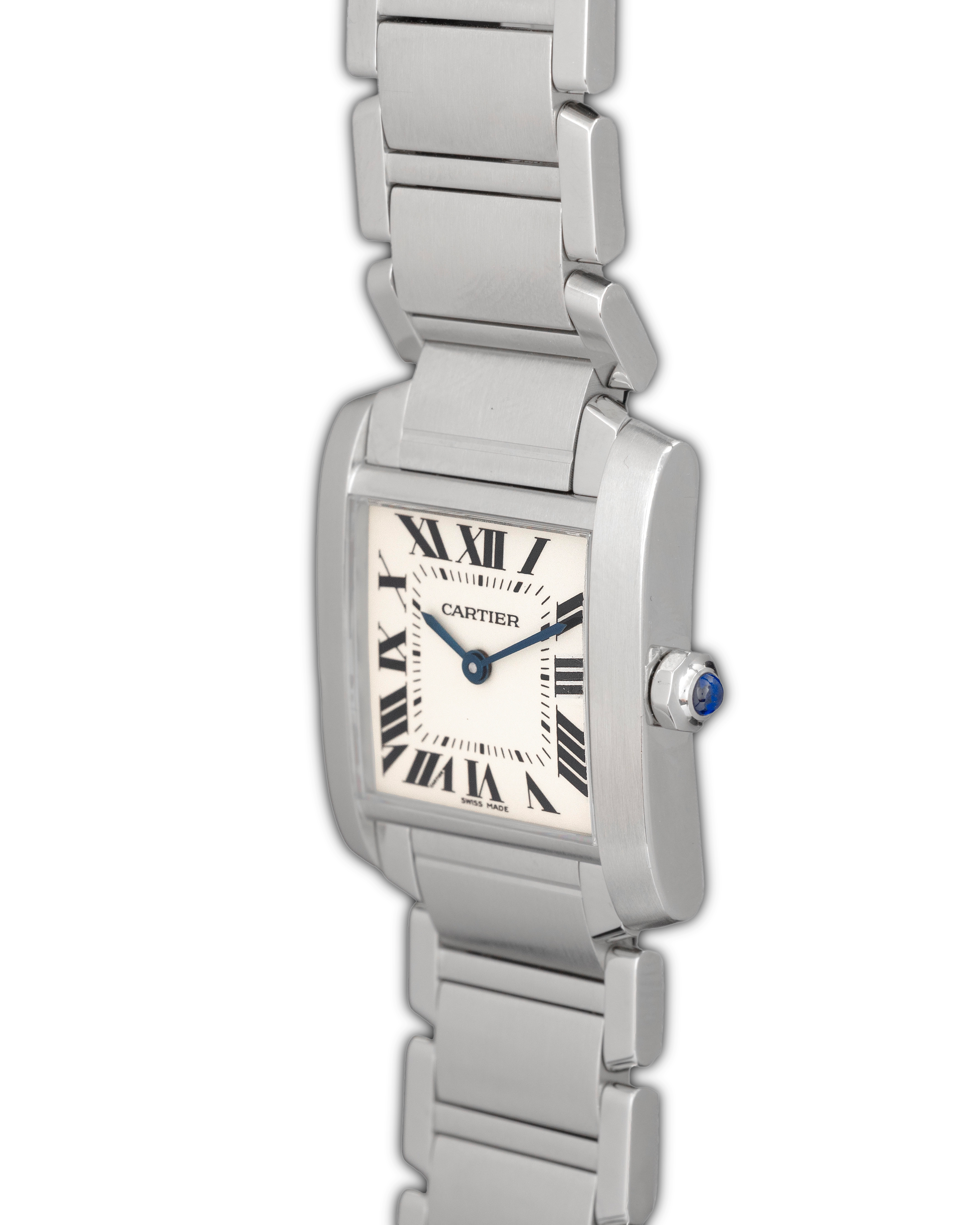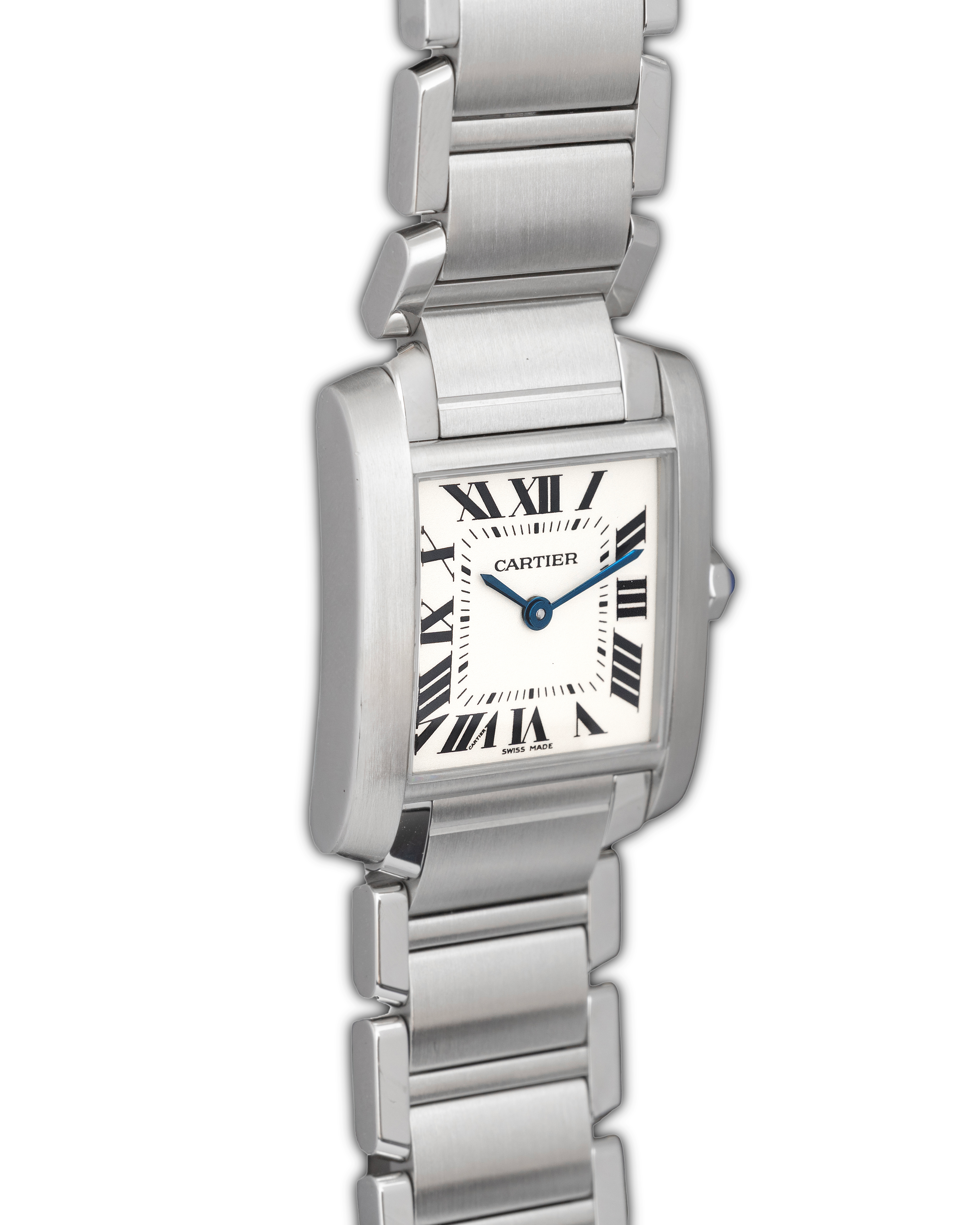 The Cartier Tank Française 2384 is a ladies’ watch with a 25 mm stainless steel case, silvered dial with Roman numerals, and a steel link bracelet. Powered by a Swiss quartz movement, it embodies Cartier’s timeless elegance in a compact and refined design.