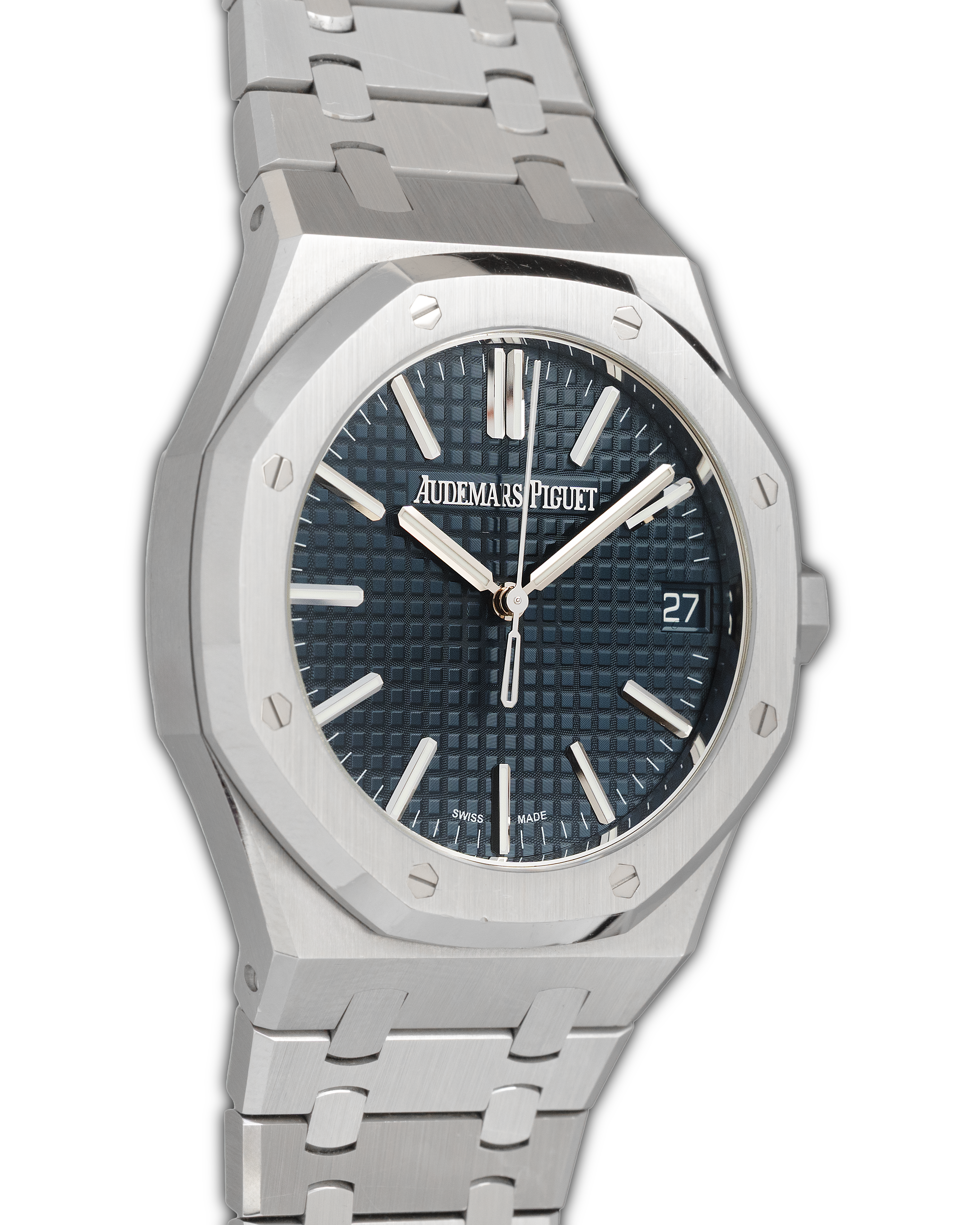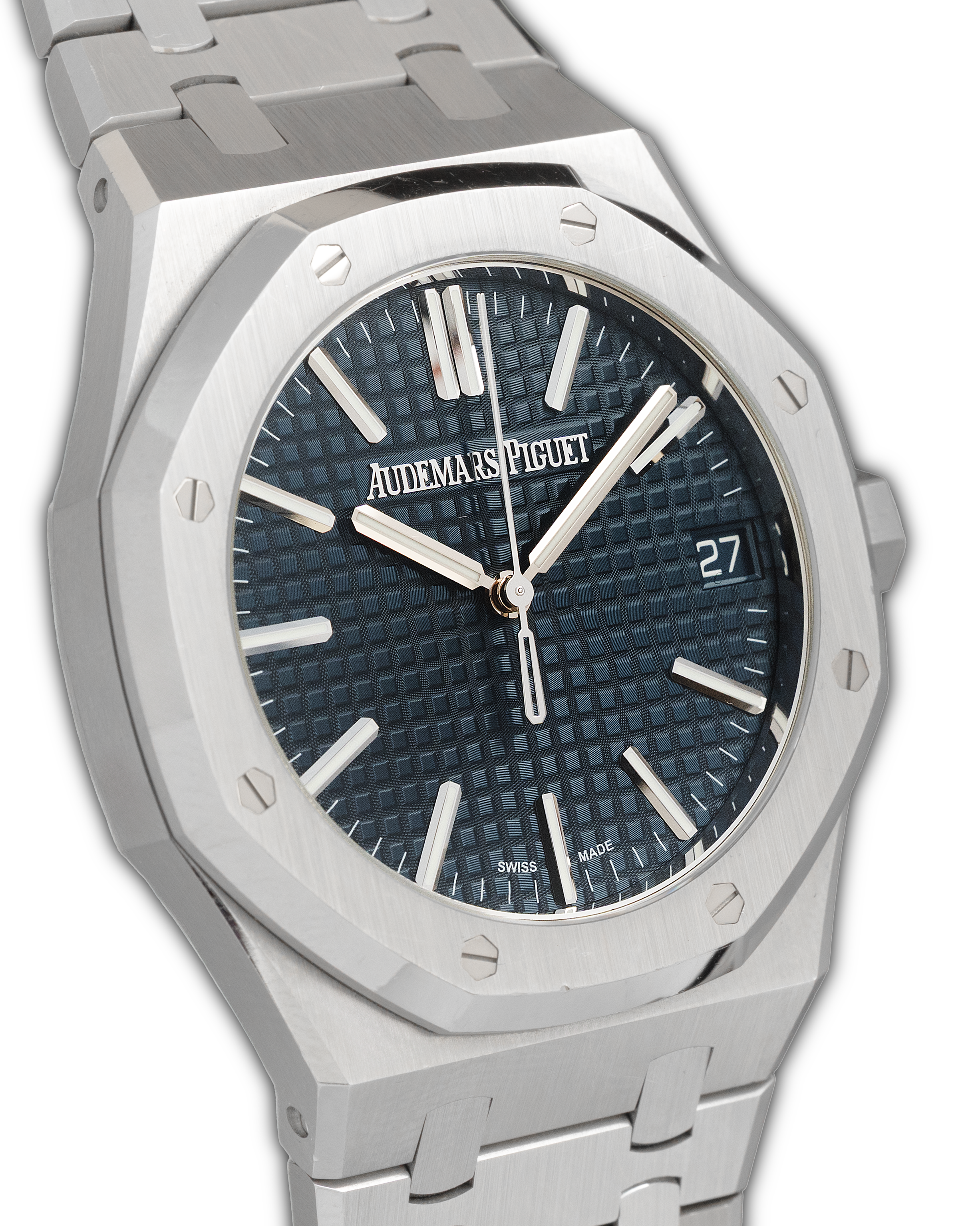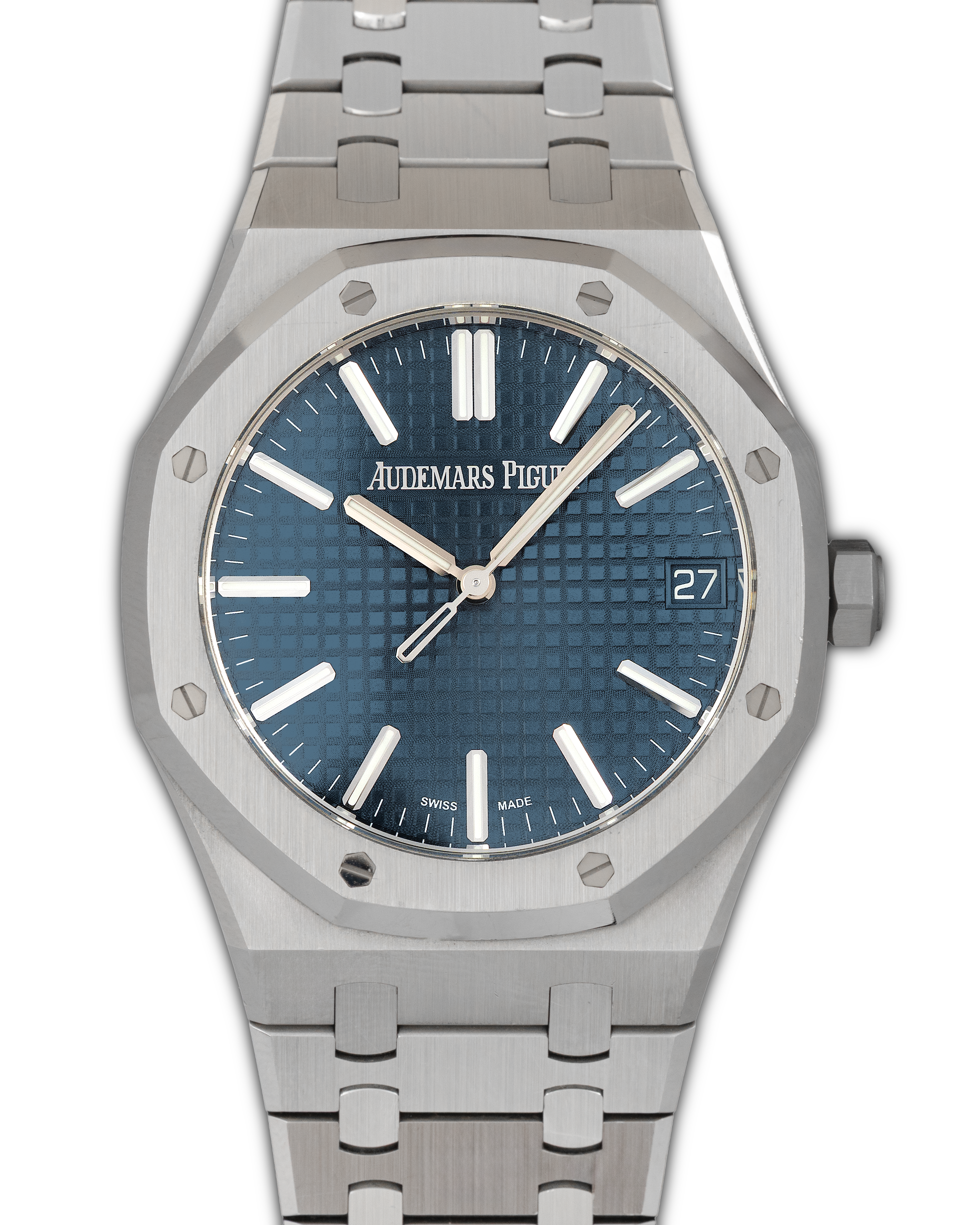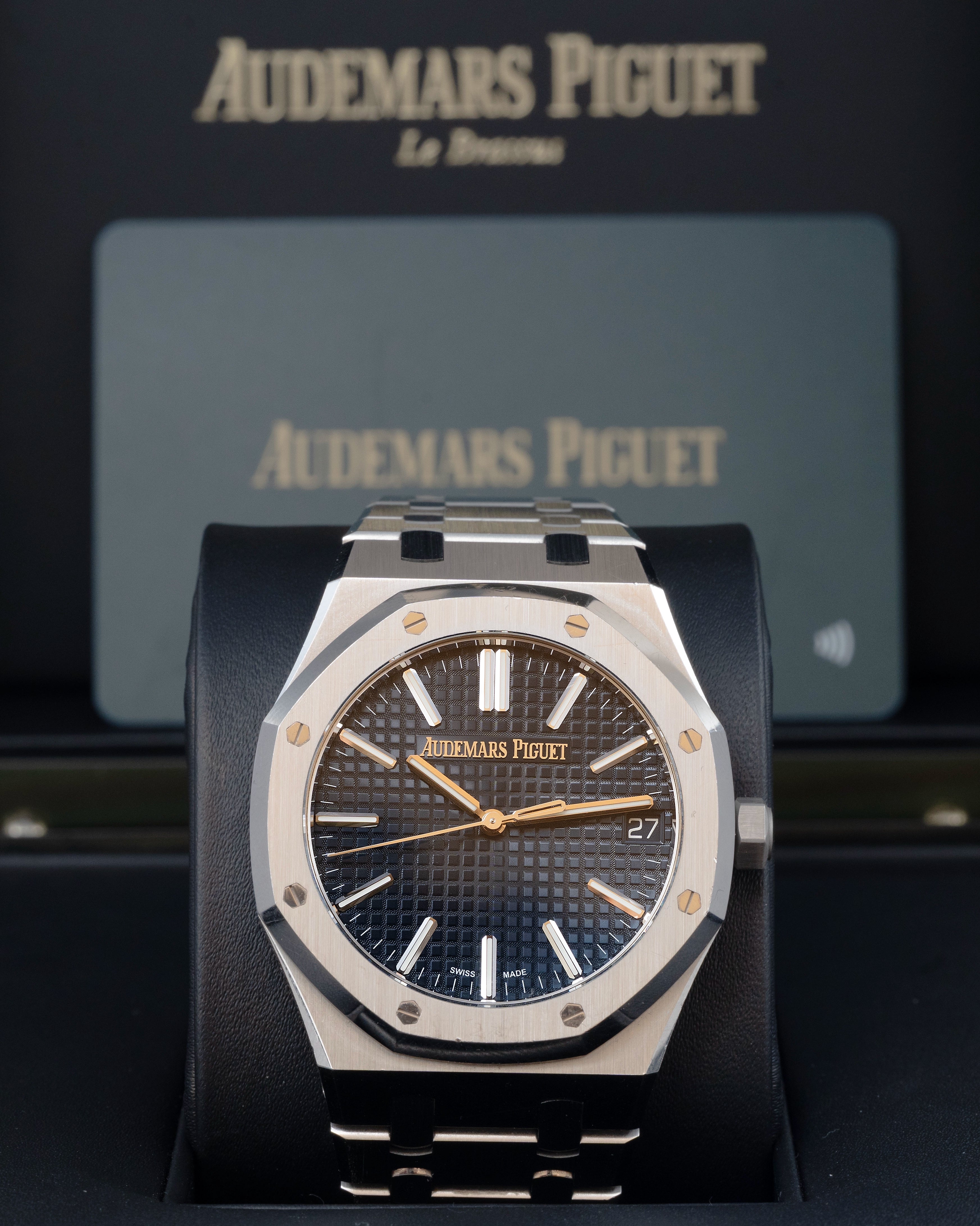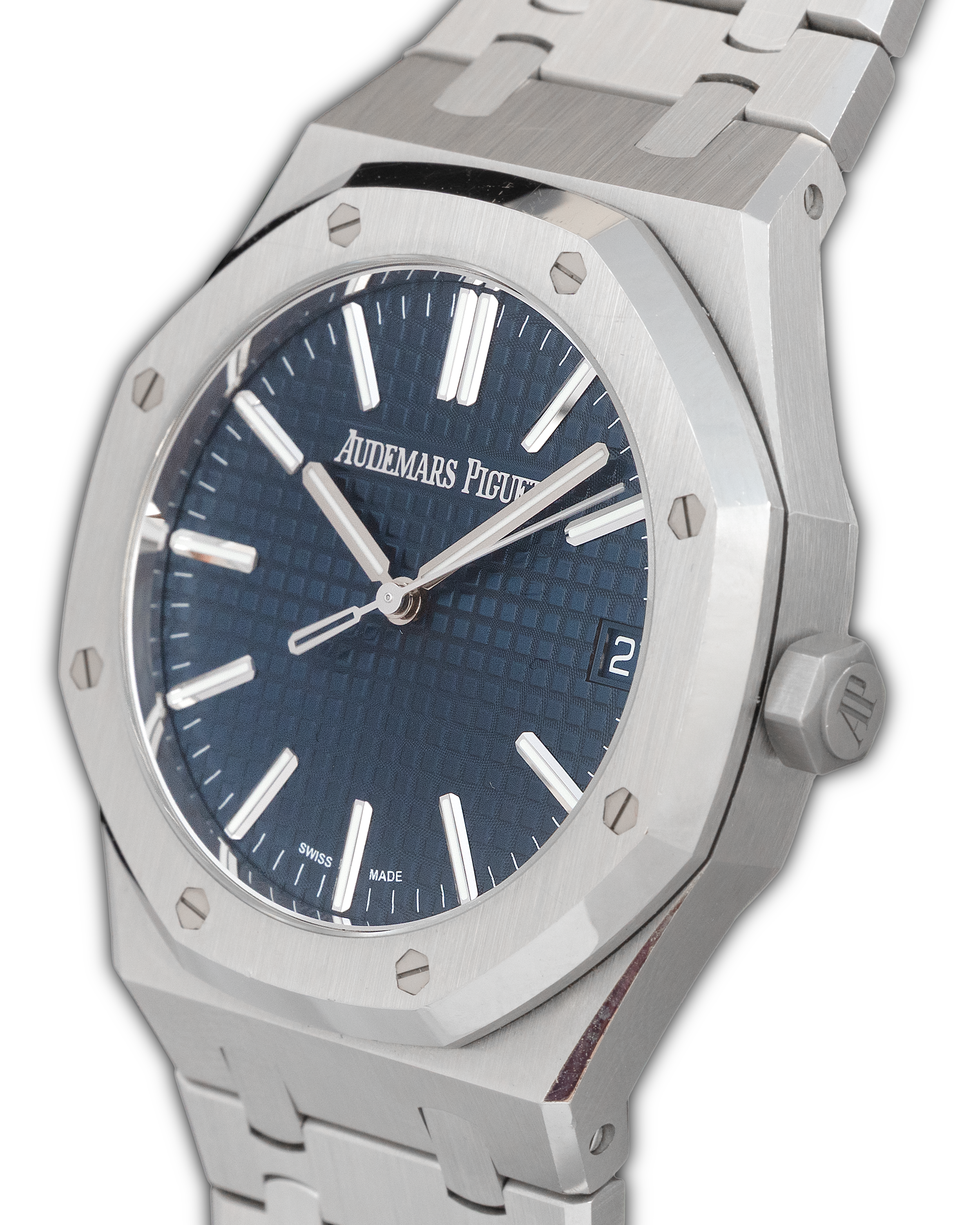 The Audemars Piguet Royal Oak Ref. 15510ST.OO.1320ST.01 represents the latest evolution of the Royal Oak Selfwinding line. Its 41 mm stainless-steel case retains Gérald Genta’s legendary design while offering refined ergonomics and enhanced finishing. The signature octagonal bezel with white-gold screws sits above a stunning blue “Grande Tapisserie” dial, whose square pattern and sun-tinted tone create shifting reflections that emphasize the model’s sporty-elegant character. The updated dial layout, slimmer indices, and refined minute track enhance clarity and balance. Powered by the Caliber 4302, a next-generation automatic movement with a 70-hour power reserve and a beautifully decorated 22K gold oscillating mass, the 15510ST is visible through a sapphire caseback. Completed with an integrated steel bracelet featuring updated tapering and a secure AP folding clasp, this reference stands as one of the most contemporary and desirable Royal Oak configurations.