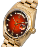 A rare and opulent 1977 Day-Date featuring a factory red vignette dial with diamond markers. Full 18k yellow gold construction and vintage President allure.
