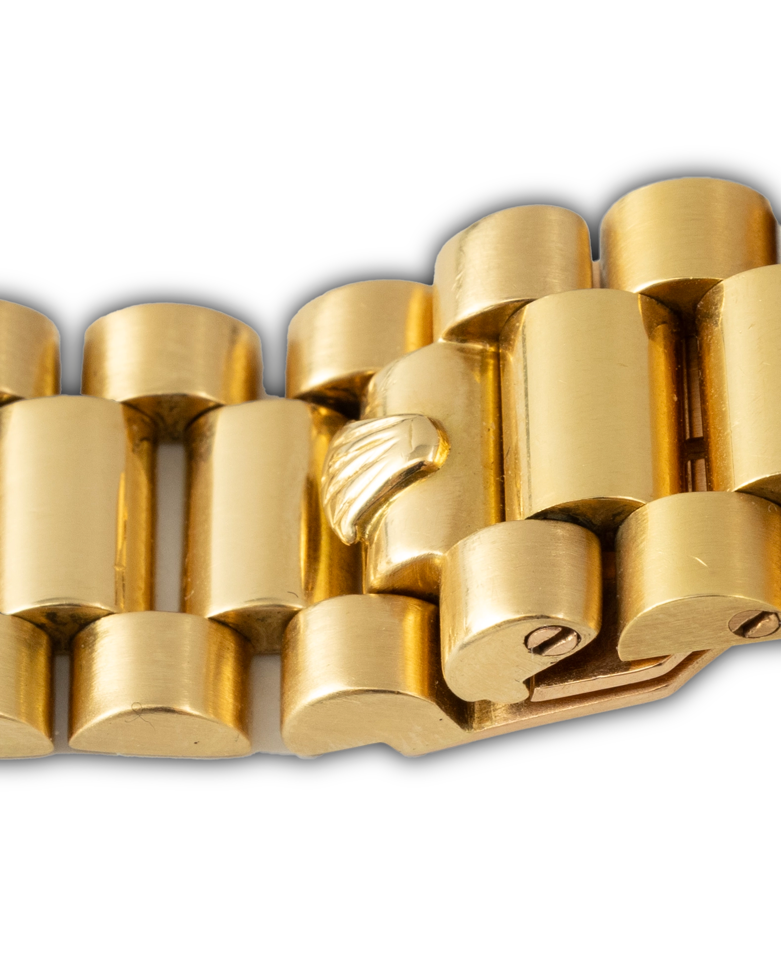 Known for their bold presence and limited production, vignette dials were part of Rolex’s more experimental and luxurious designs during the late 1970s and 1980s, mostly reserved for Day-Date references. The 18k yellow gold case and President bracelet complete the picture, offering timeless prestige and unmistakable wrist presence.