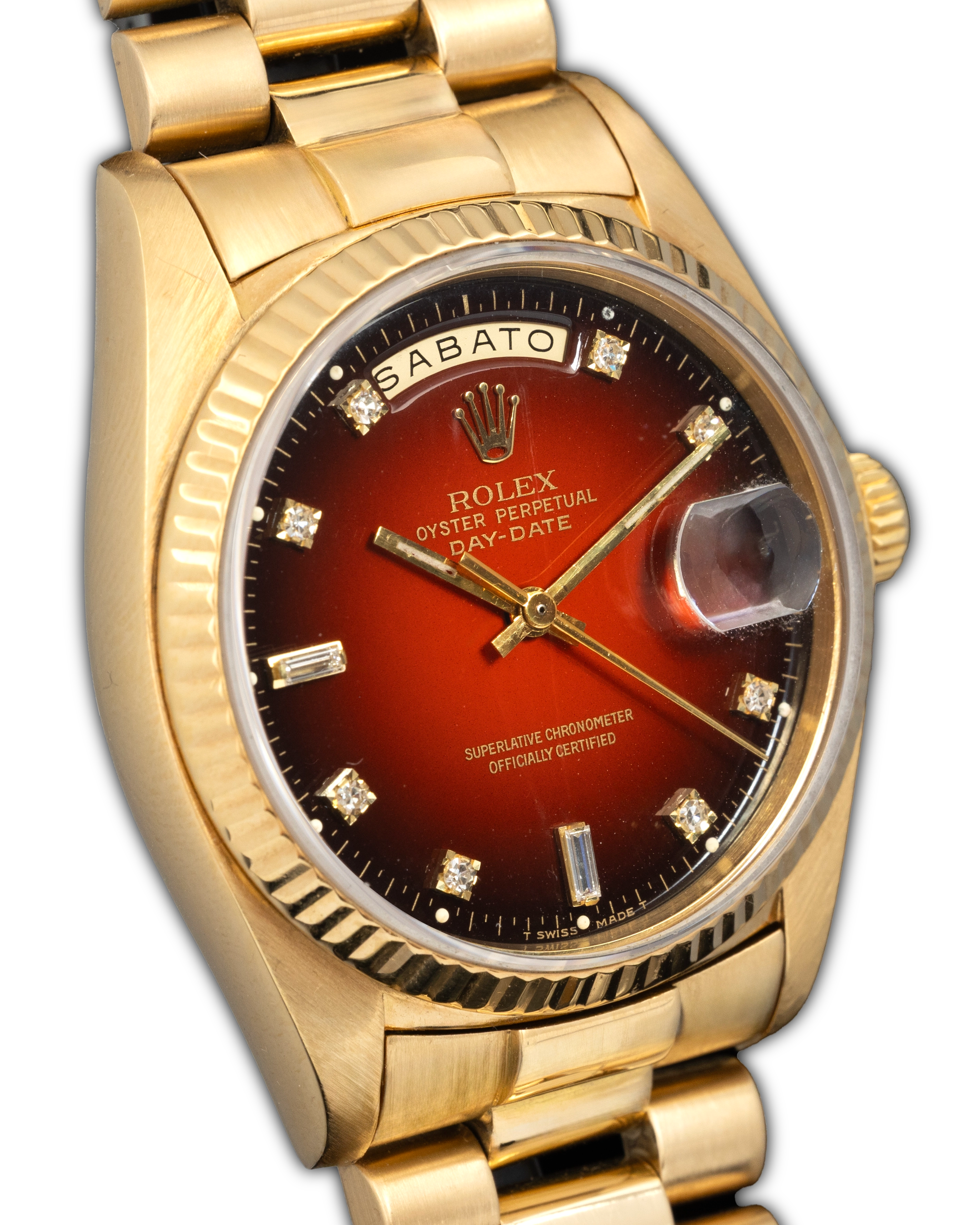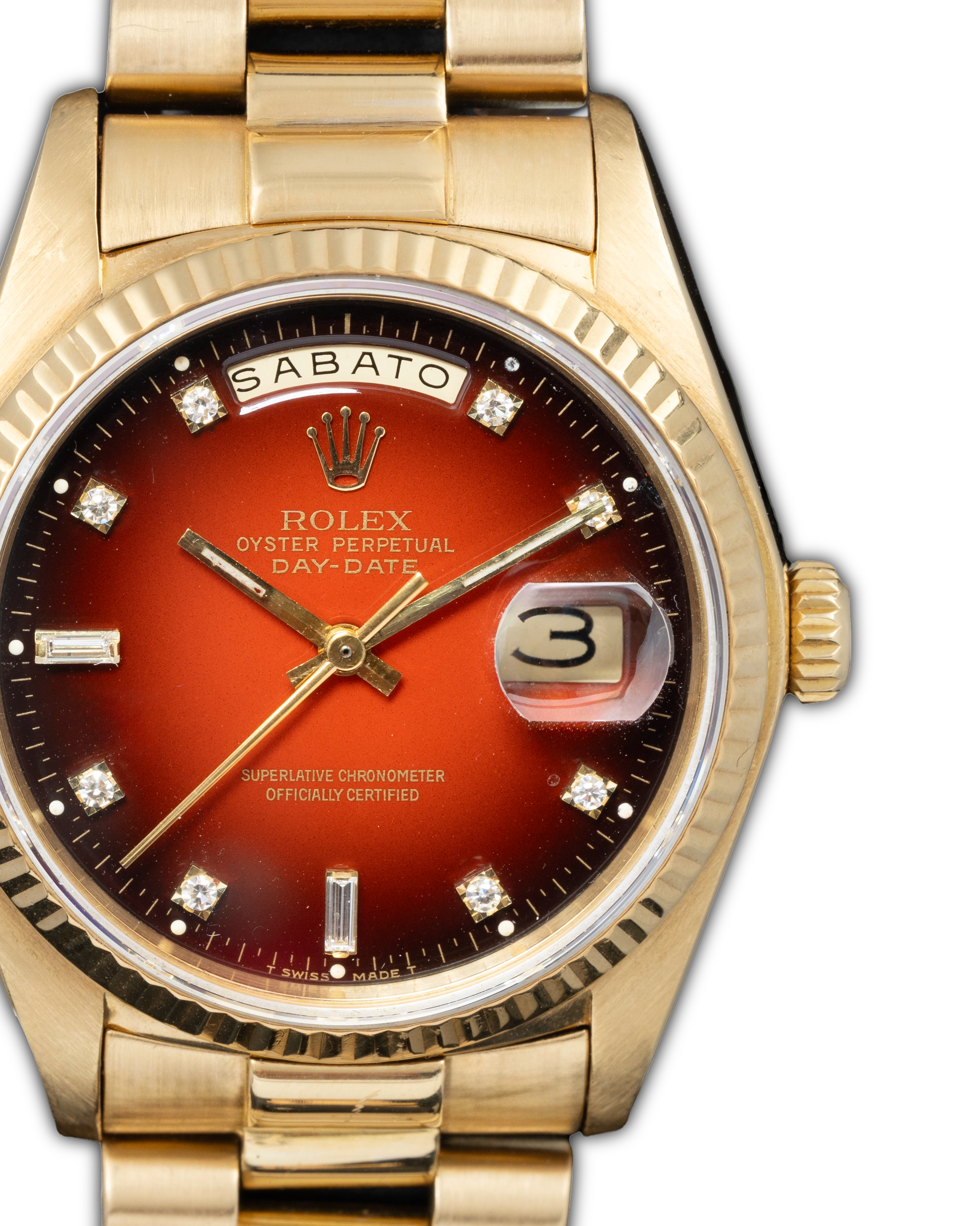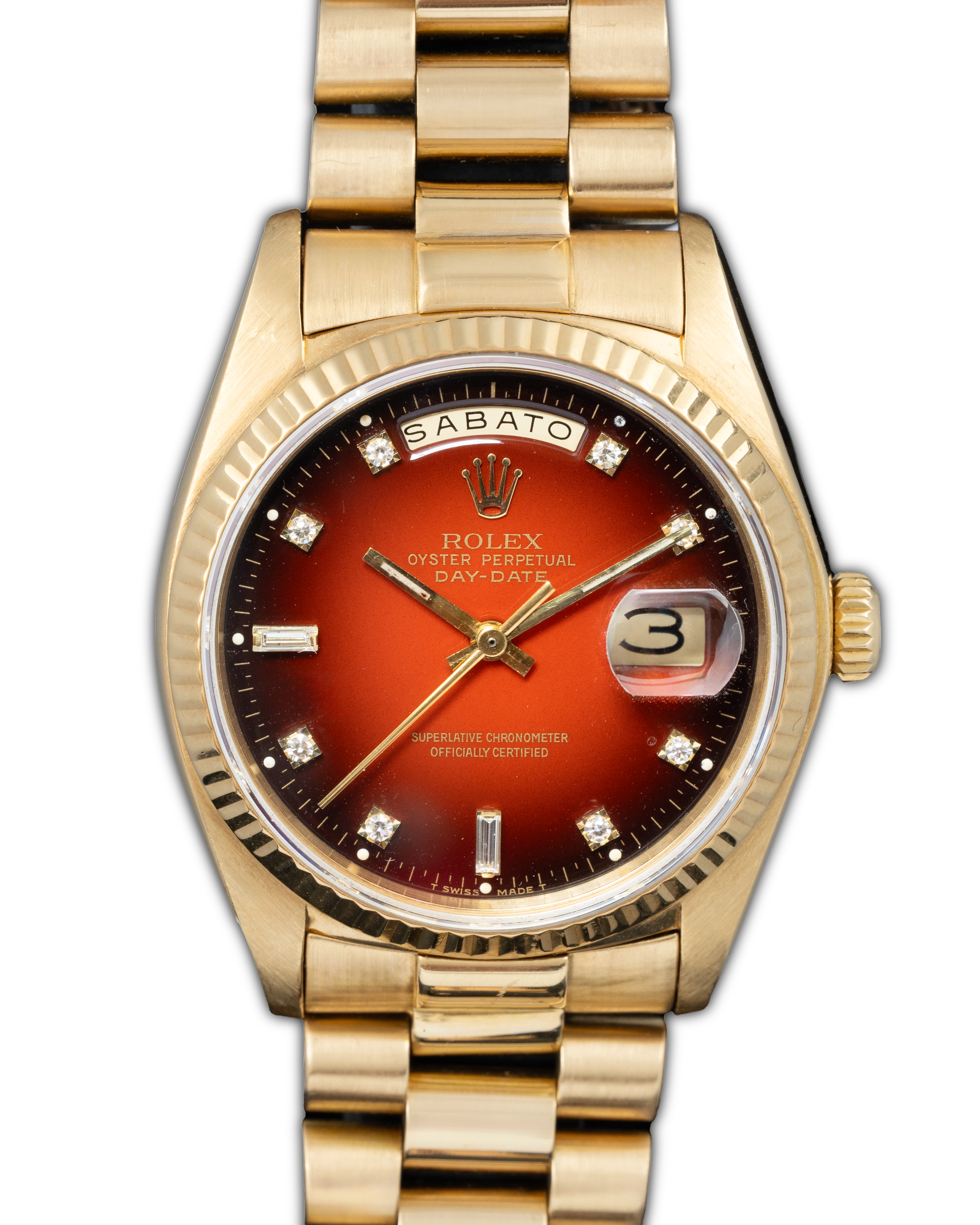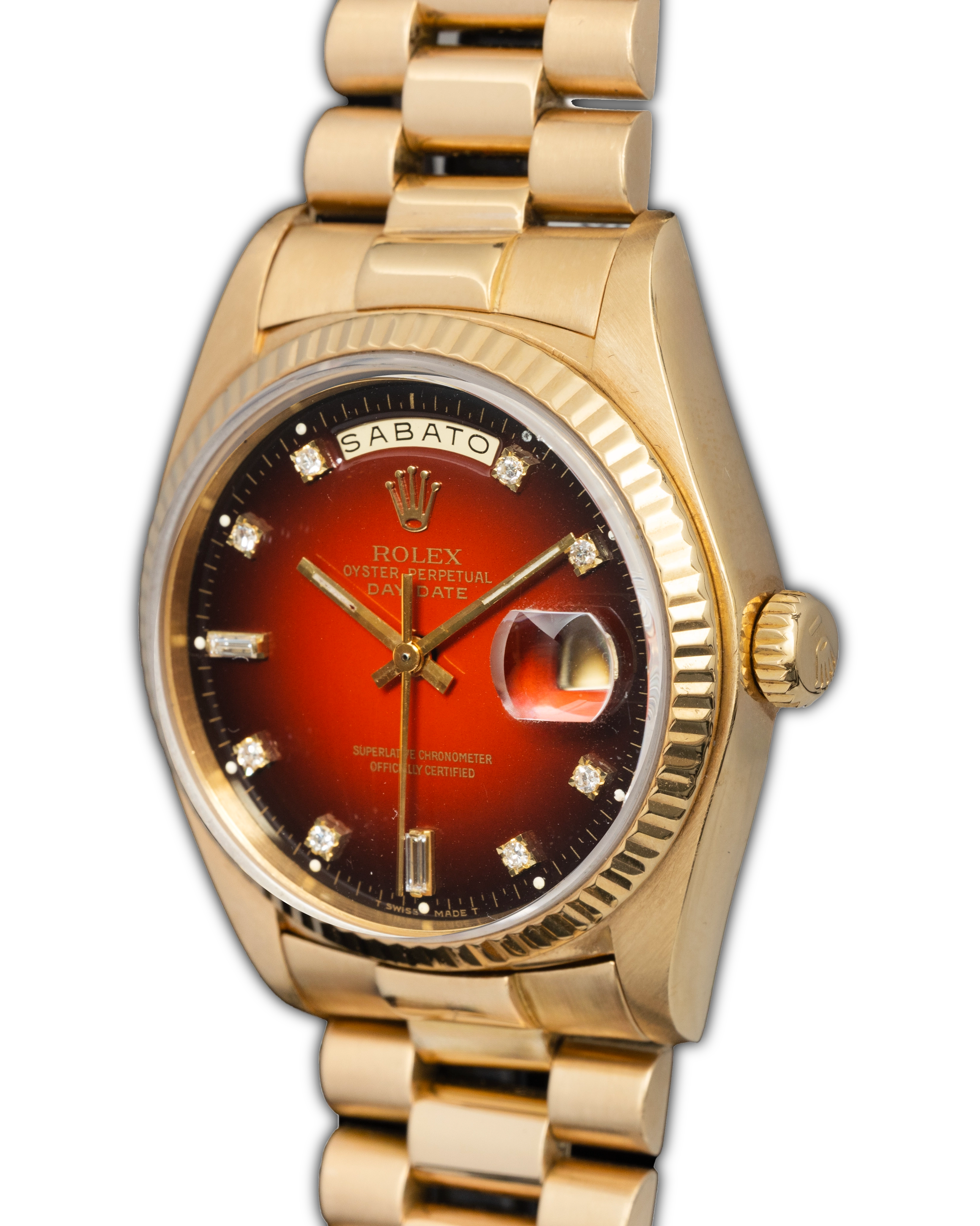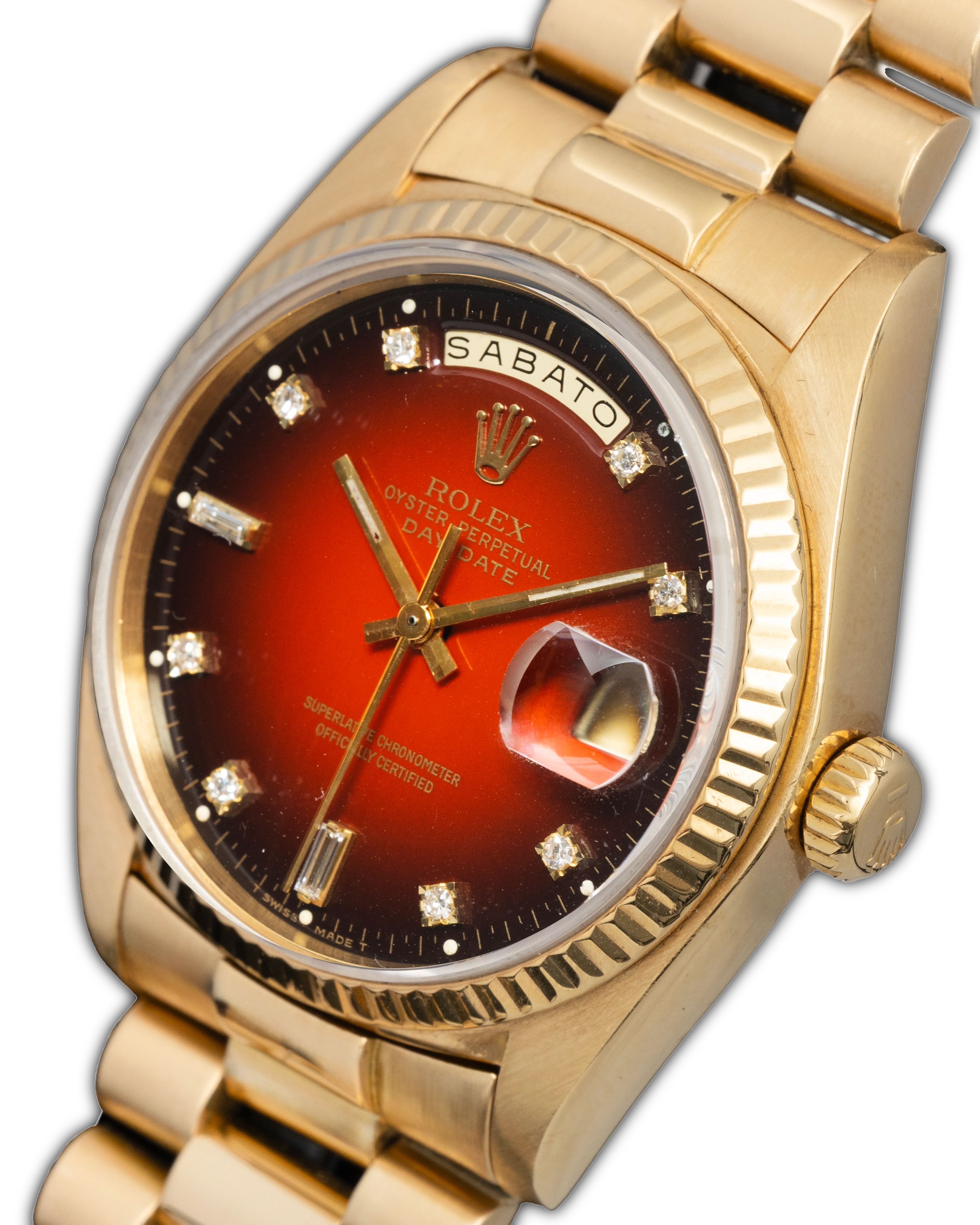 This Rolex Day-Date reference 18038, produced in 1977, is a stunning early example of the single-quickset generation of the iconic President. What makes this piece truly exceptional is its factory red vignette dial — a fiery gradient that fades from bright crimson at the center to deep wine red at the edges, paired with diamond hour markers.
