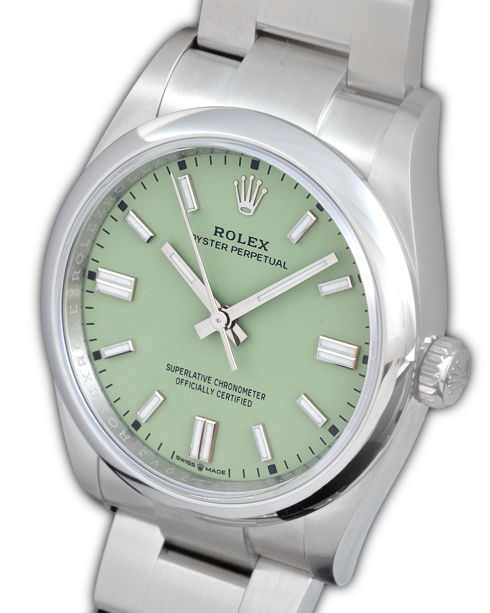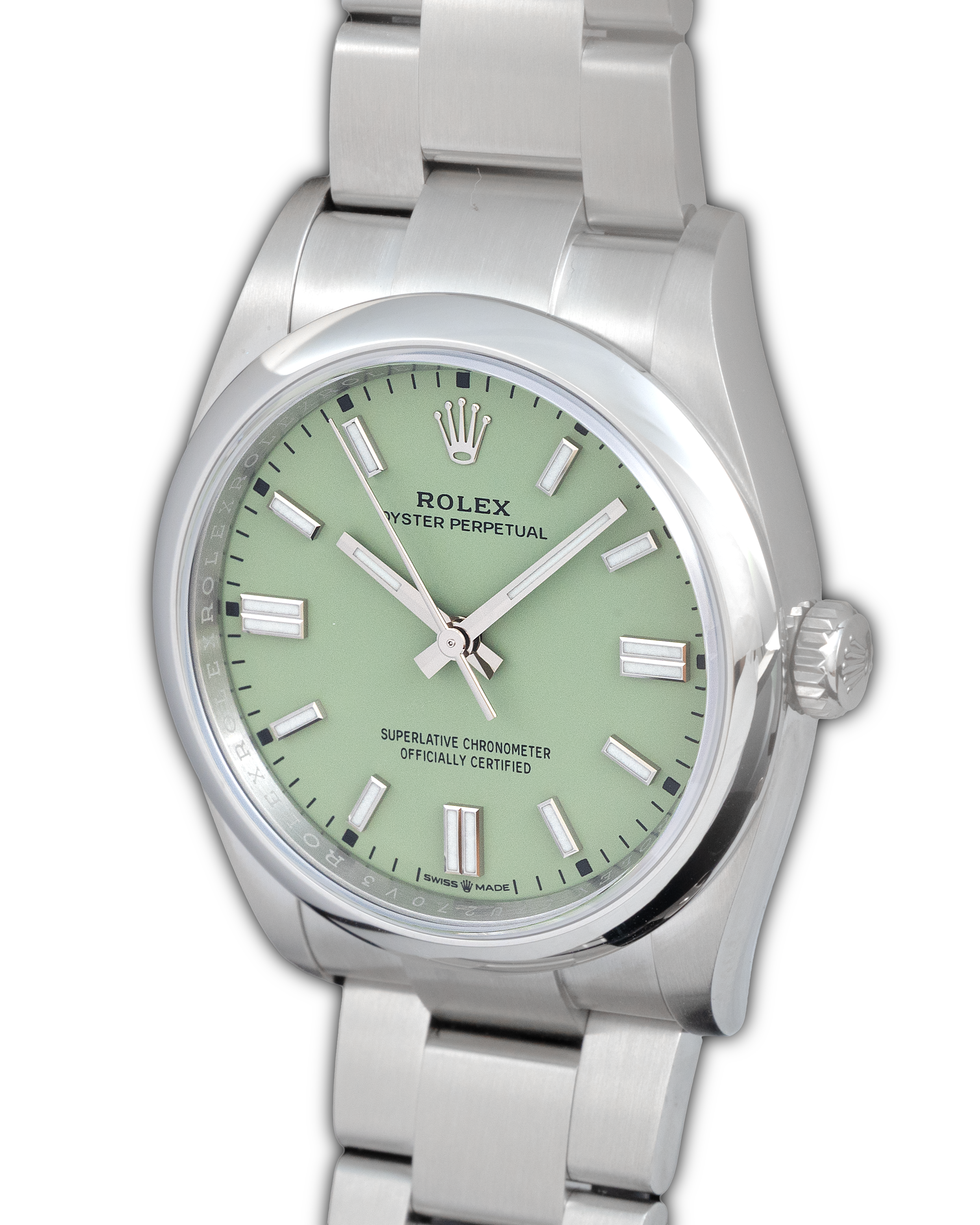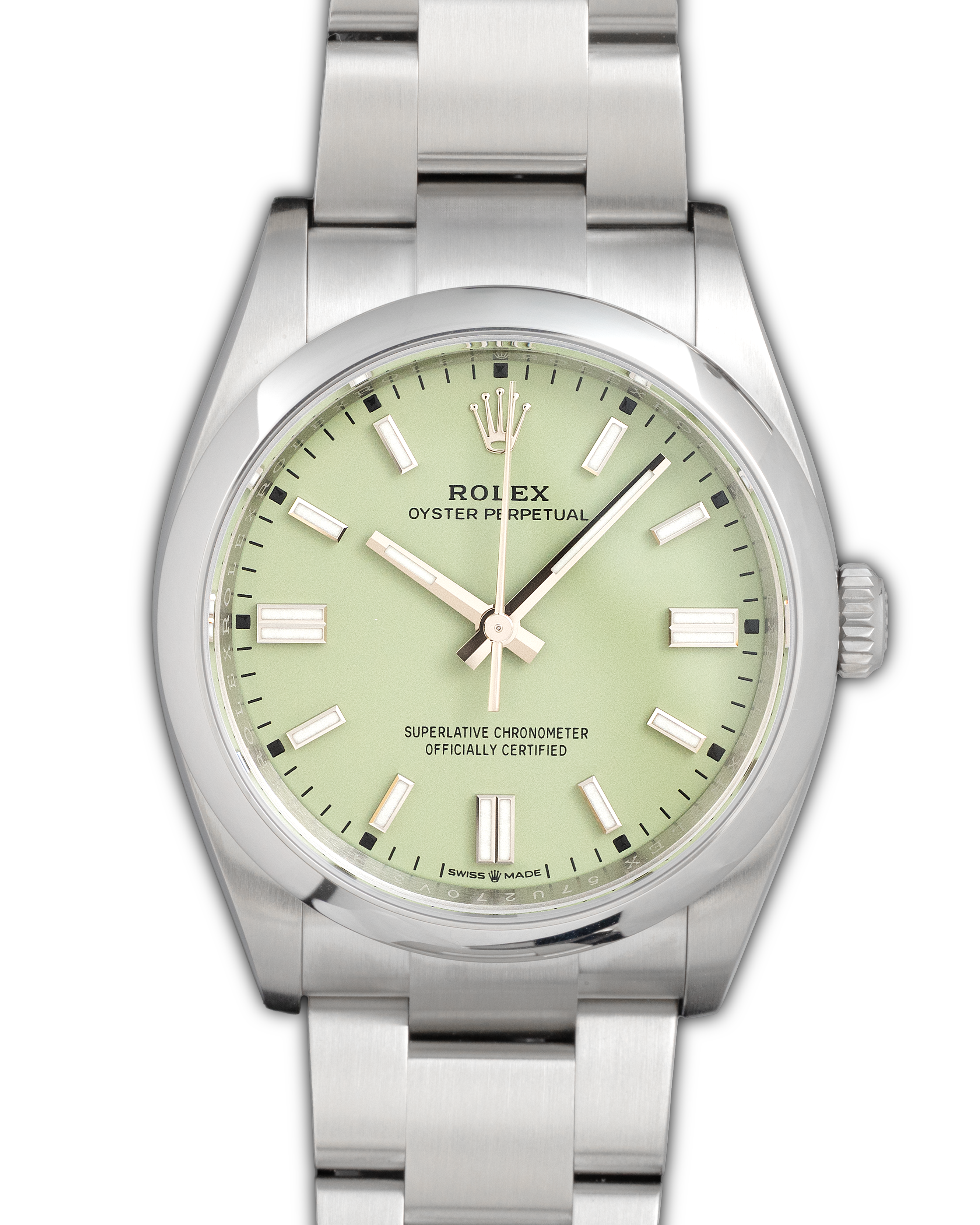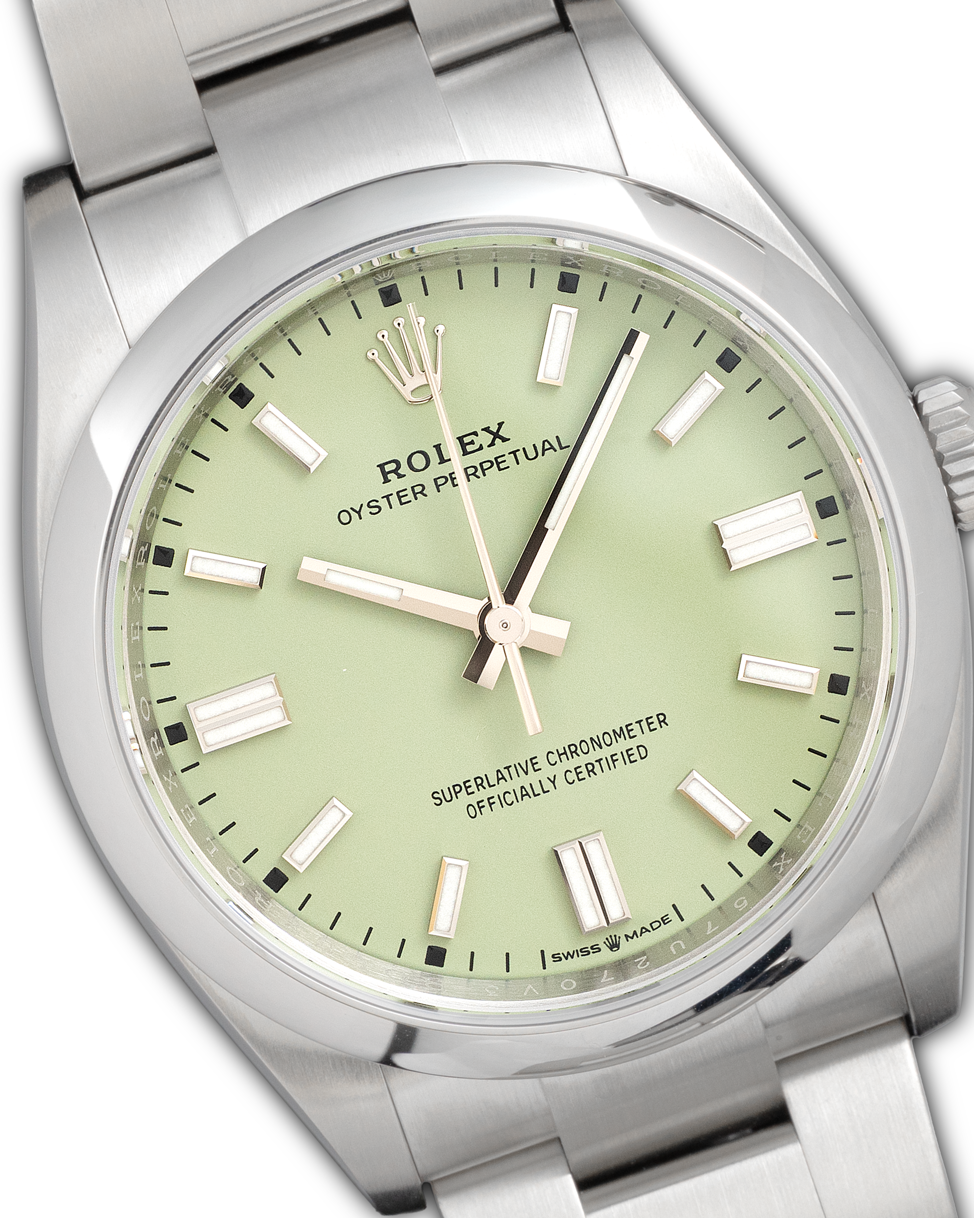 The Rolex Oyster Perpetual 134300 with pistachio dial is a fresh and contemporary expression of Rolex’s most essential model, combining a vibrant pastel tone with the refined proportions of the 41 mm Oystersteel case.
