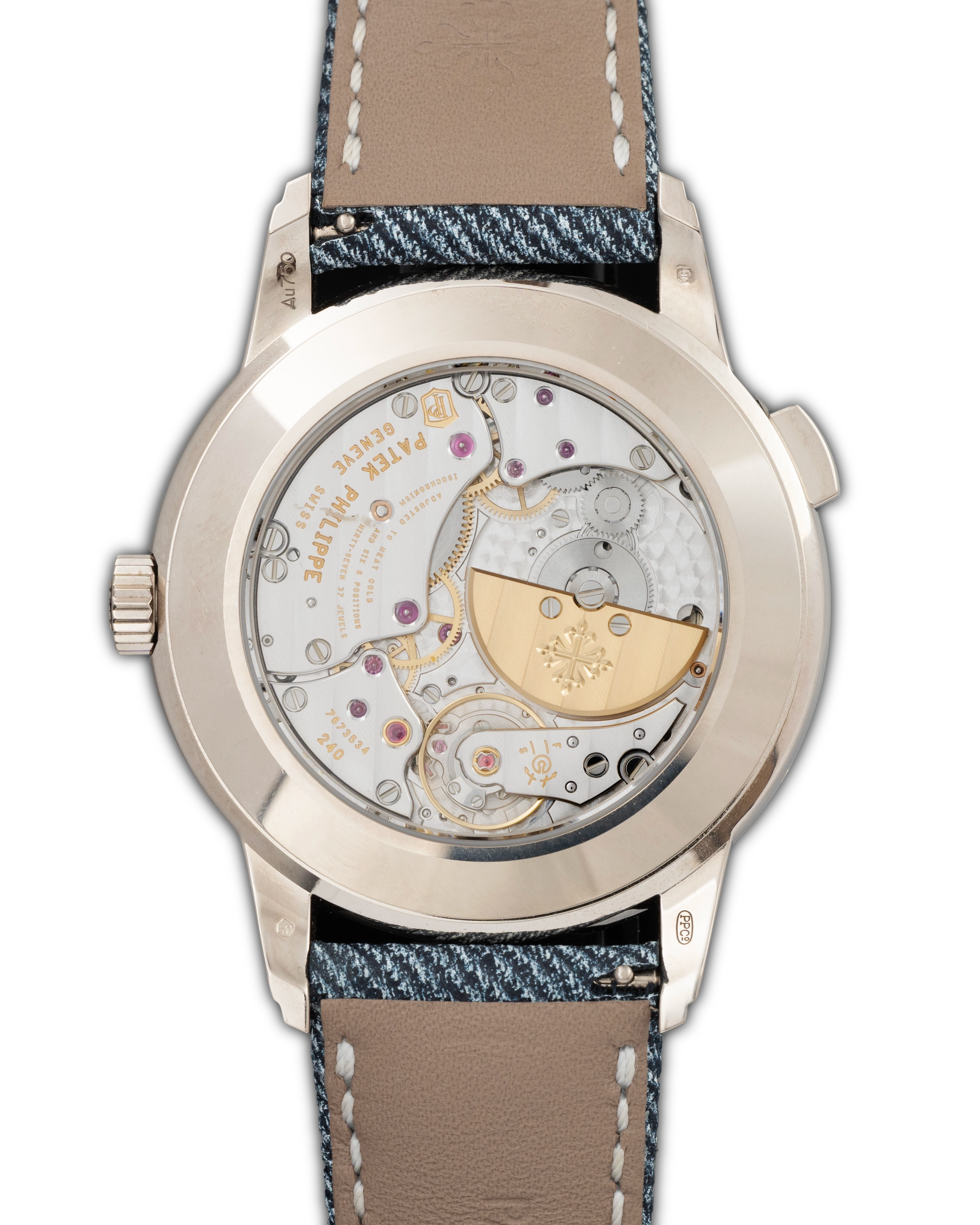Inside beats the new self-winding Caliber 240 HU C, built upon Patek’s ultra-thin micro-rotor architecture with the added patented date mechanism for local time. It offers a power reserve of approximately 48 hours and is visible through the sapphire crystal case back.